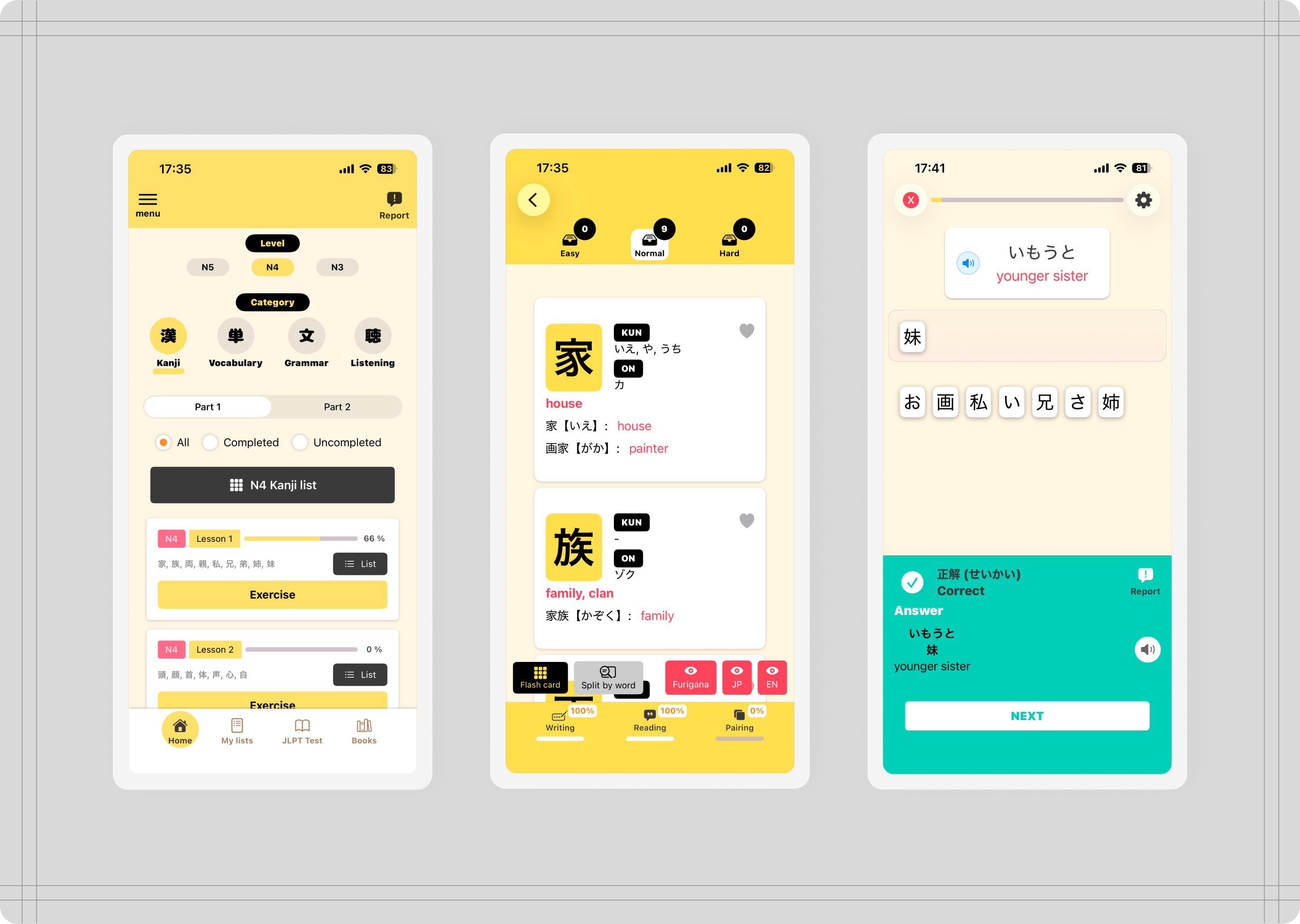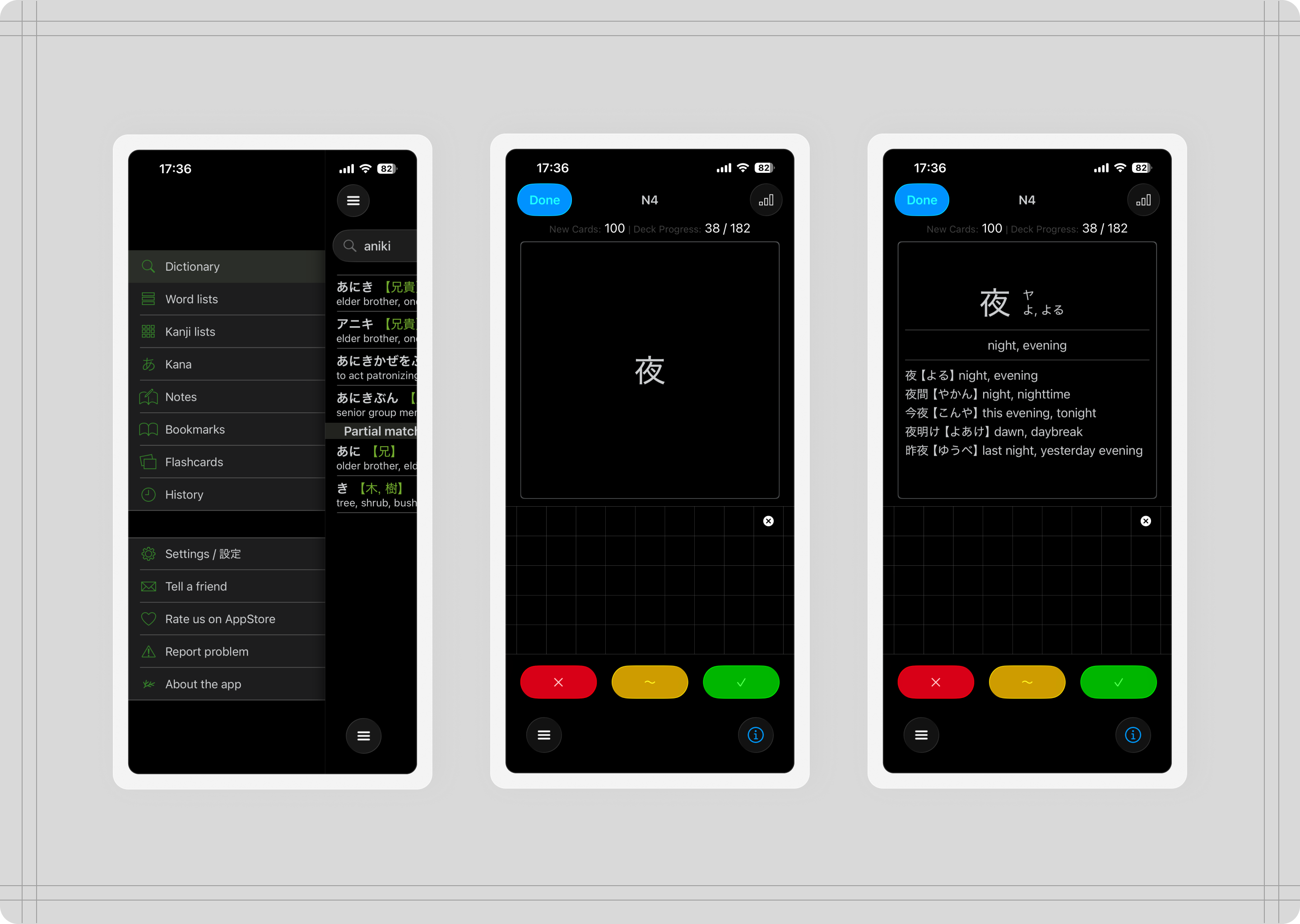 Opening a deck takes you to flashcards. Front side holds the word in kanji and kana, the back side holds word's meaning, readings, and example sentence.