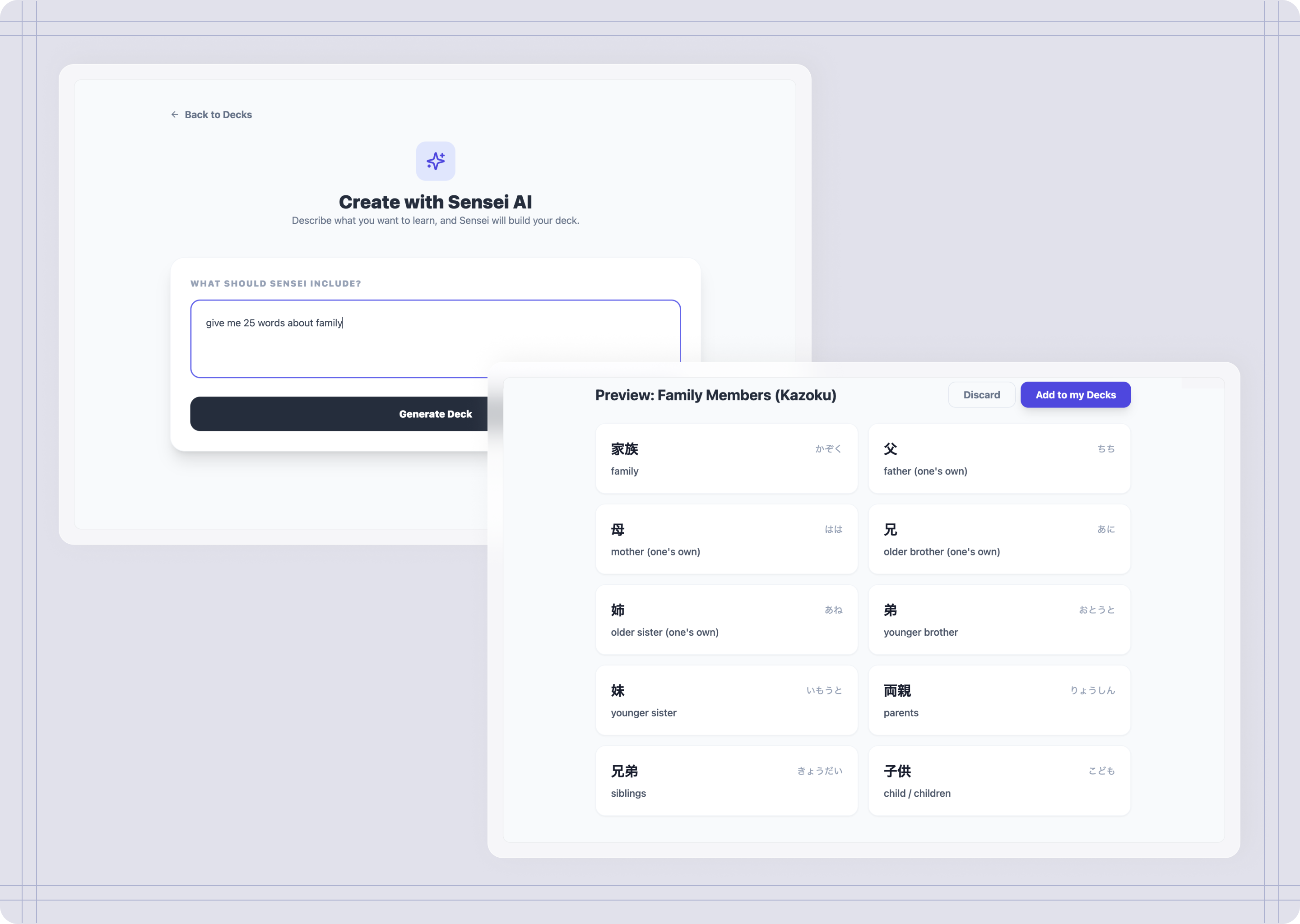 Although this feature came in later iterations, I have specified I wanted to be able to build my own decks with help of Sensei by integrating AI into the tool. At first, AI understood the assignment, allowing me to give a prompt and then creating a deck. However there were some issues: