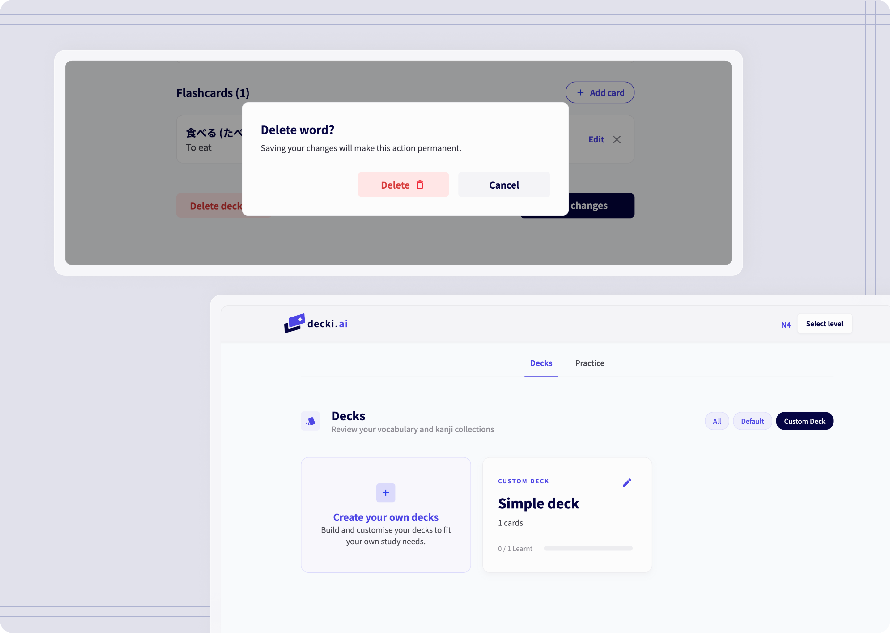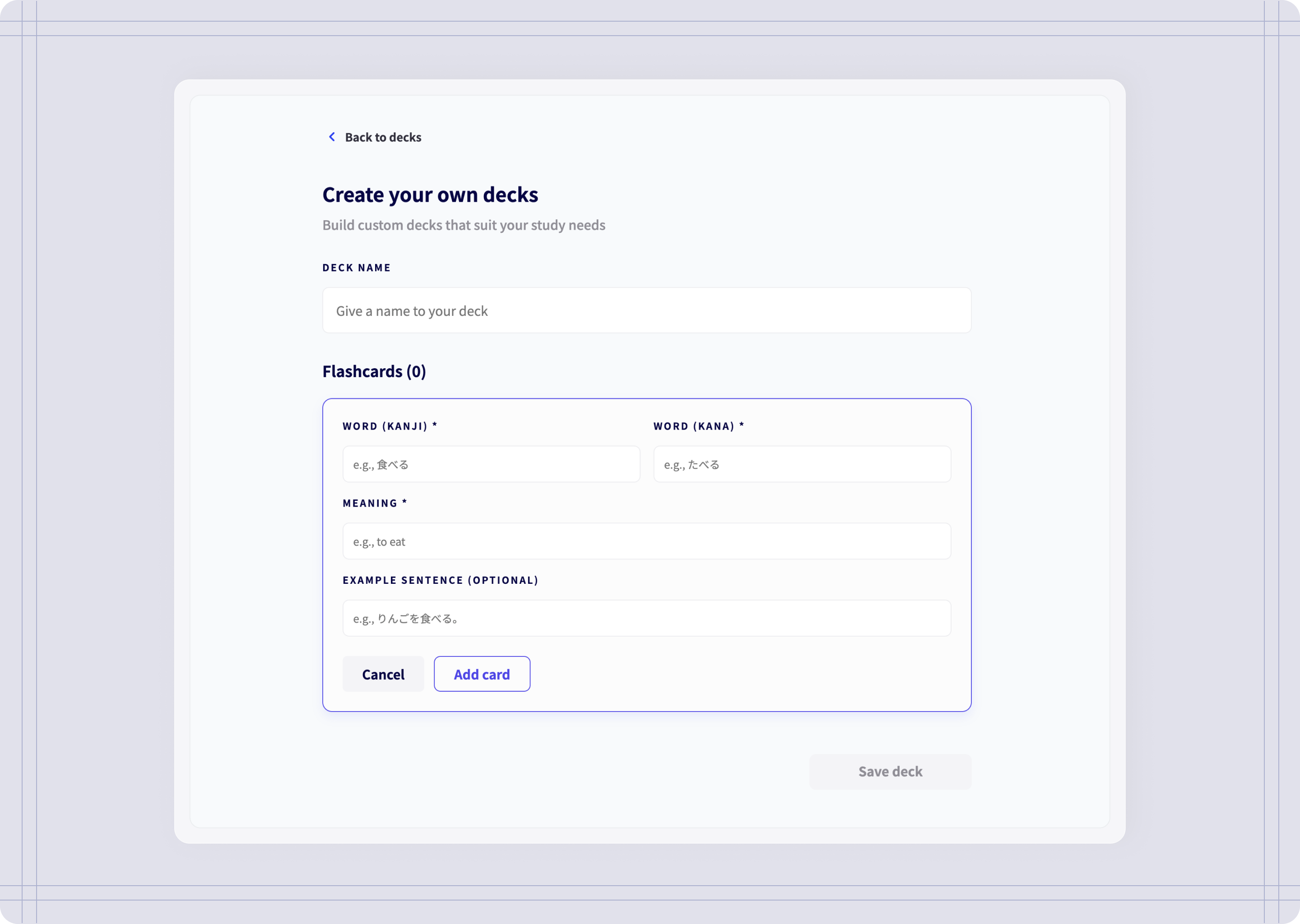 I built decki.ai, a Japanese flashcard tool designed to bridge the gap between passive memorisation and active conversation. Recognising that existing tools (Anki, WaniKani) focus primarily on input, I designed an "output loop" that requires students to draft original sentences to achieve fluency.